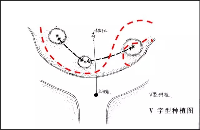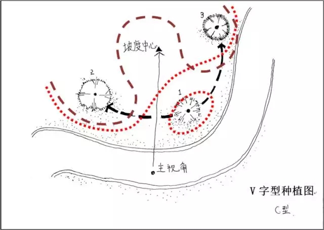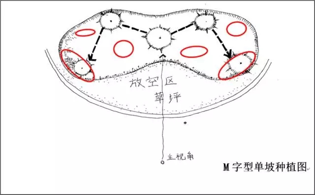 定位技巧:先定点主视角线上的第一棵,再定主视角近端一棵,最后是远端。角度根据坡型适当平行打开,避免直角、等边。主视角前方选择矮胖型植株(红色虚线为可参照的林缘线条)。