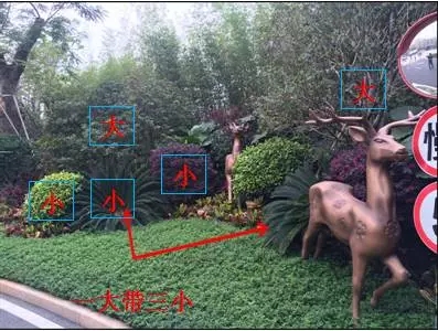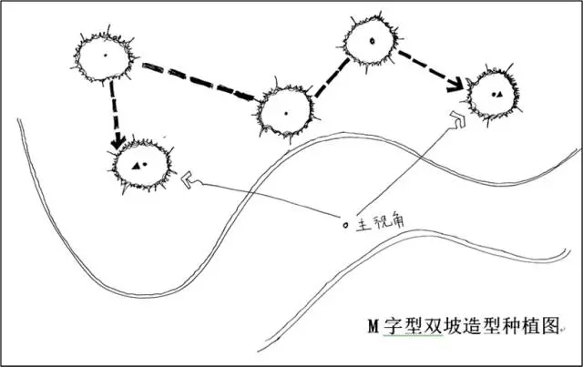 定位技巧:选取坡地高点种植单棵骨架乔木,其体量要明显大于二乔,结合实际在其外围使用V字型或C字型搭配二乔。