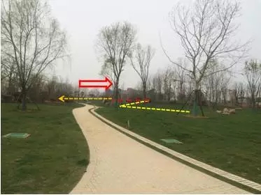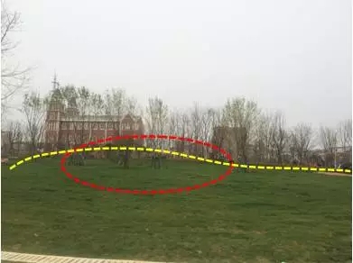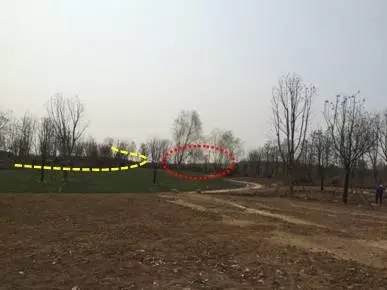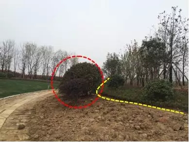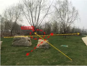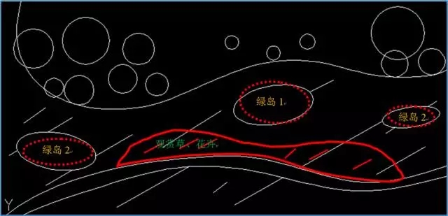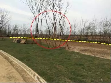 红圈位置是两处主要视线的结合点,黄色虚线为游人视线方向,红色虚线是林缘与道路的距离,散点树与背后组团要保持较好的空间距离,感官上相互独立界限清晰。