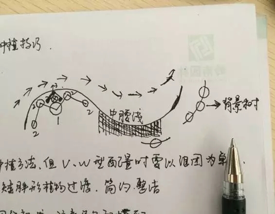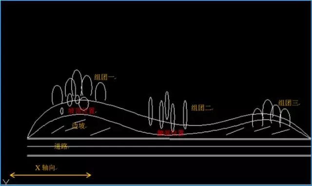 定位技巧:选取两坡的最高点为发起点,两坡大小相差较大时,采取四六分的原则,中间过渡位置向大坡偏移,高差较大时同样适用。若出现小坡高于大坡且大小区分明显时,以大为参考原则。树的大小选择时有一定灵活性,中间过渡株选择最小棵,其余通常遵循在主视角上近低远高的原则。