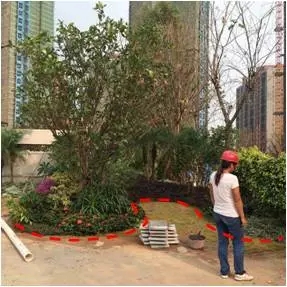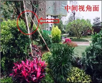❹在无参照物时,可以先种一棵大球作为石头参考,以此定位,位置选主视角线上,景观突出点或弱点。