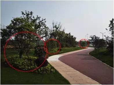 在部分节点位置选择将观赏度高的植物跳出来单独运用,能够打破组团线条和框架的限制,产生耳目一新的效果,但组团(黄线)与孤植(红圈)分隔应更清晰。