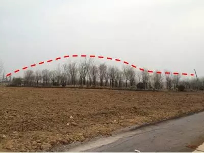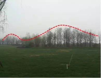 定位技巧:以坡地高点为圆心,选定主视角线上第一棵,并以圆心与此点之间距离为半径,基本平行于地形的外围弧线做圆,在圆弧上选取合适的第二和第三点(红色虚线为可参照的林缘线条)。
