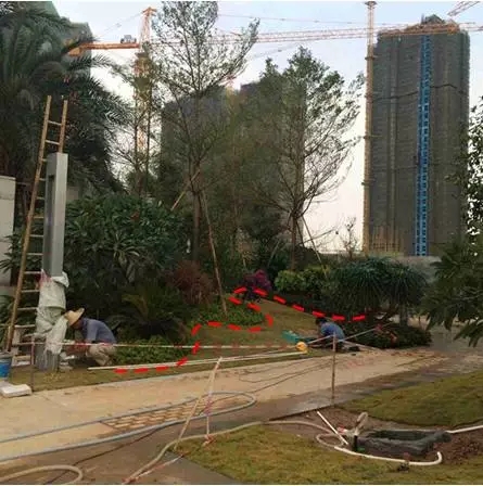 ❸ 铺植草皮:以硬铺装结合部分为基线往外铺,不留缝,异形接口部分使用剪刀按形剪切。注意草皮上口基准面应低于硬质铺装两公分左右,与包边苗接口部位留出5公分,铺植完成后做切沟处理。