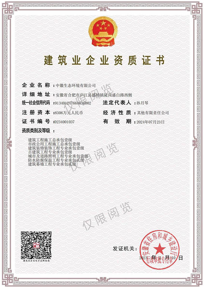 截至目前,集团已获批建筑工程施工总承包壹级、市政公用工程施工总承包壹级“双壹级”总承包资质,建筑装修装饰工程专业承包壹级、古建筑工程专业承包壹级、城市及道路照明工程专业承包壹级、城市园林绿化壹级共6项壹级资质;风景园林工程设计专项甲级、城乡规划编制乙级、地质灾害治理工程设计乙级等21项规划、设计、施工资质。