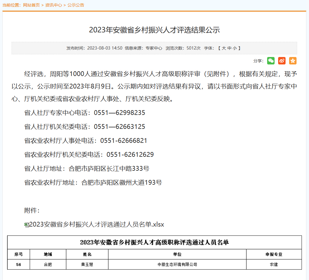 近日,安徽省人力资源和社会保障厅发布2023年安徽省乡村振兴人才评选结果,中徽集团副总裁黄玉慧成功通过评选,获评安徽省乡村振兴人才高级职称。