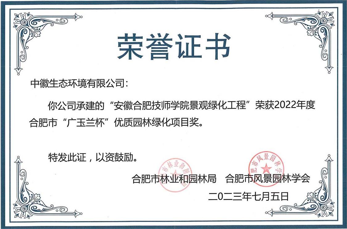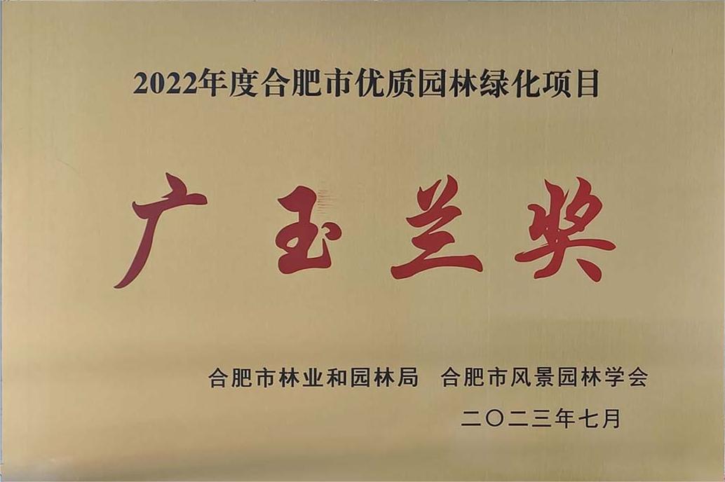 “广玉兰奖”是合肥市园林绿化工程质量方面的最高荣誉奖项,由合肥市林业和园林局组织领导,合肥市风景园林学会对参选企业资格审查、初审、现场考察,经综合评定后公开、公平、公正地评出。旨在提升合肥市园林绿化品质,巩固国家园林城市创建成果,创建国家生态园林城市,促进园林绿化工程精致设计、精心施工、精细养护,鼓励园林企业争创优质项目。