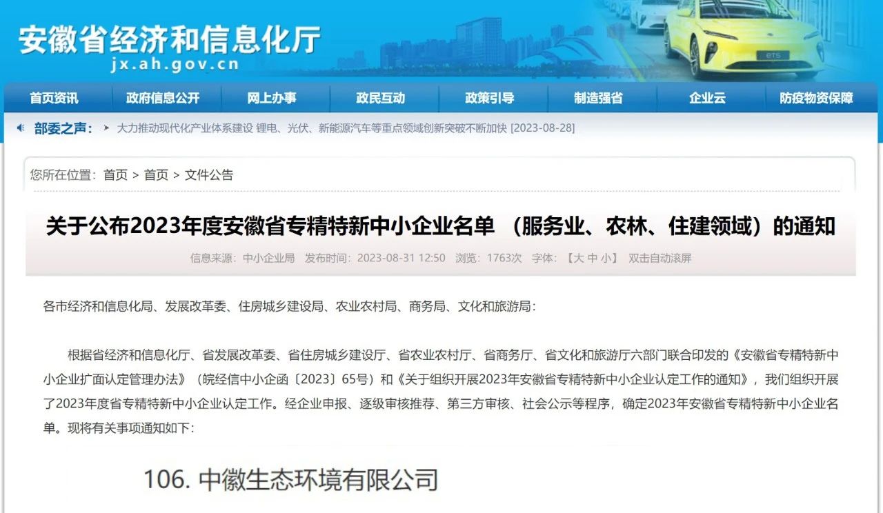 近日,安徽省经济和信息化厅发布《关于公布2023年度安徽省专精特新中小企业名单 (服务业、农林、住建领域)的通知》,中徽集团通过审核、成功入选,获评2023年度安徽省“专精特新”中小企业称号。