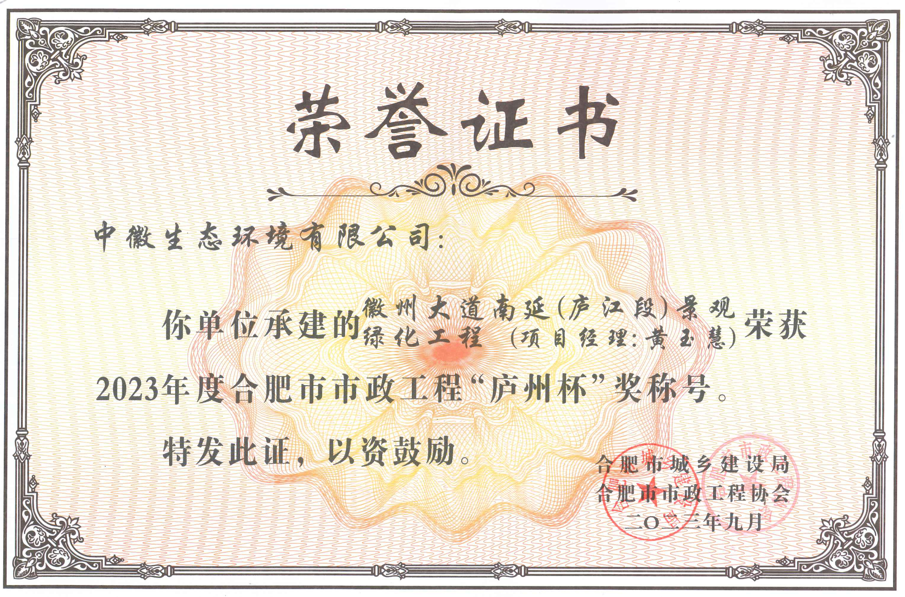 近日,合肥市市政工程协会公布2023年度合肥市市政工程“庐州杯”奖获奖项目名单,中徽集团承建的徽州大道南延(庐江段)景观绿化工程荣获2023年度合肥市市政工程“庐州杯”奖称号。