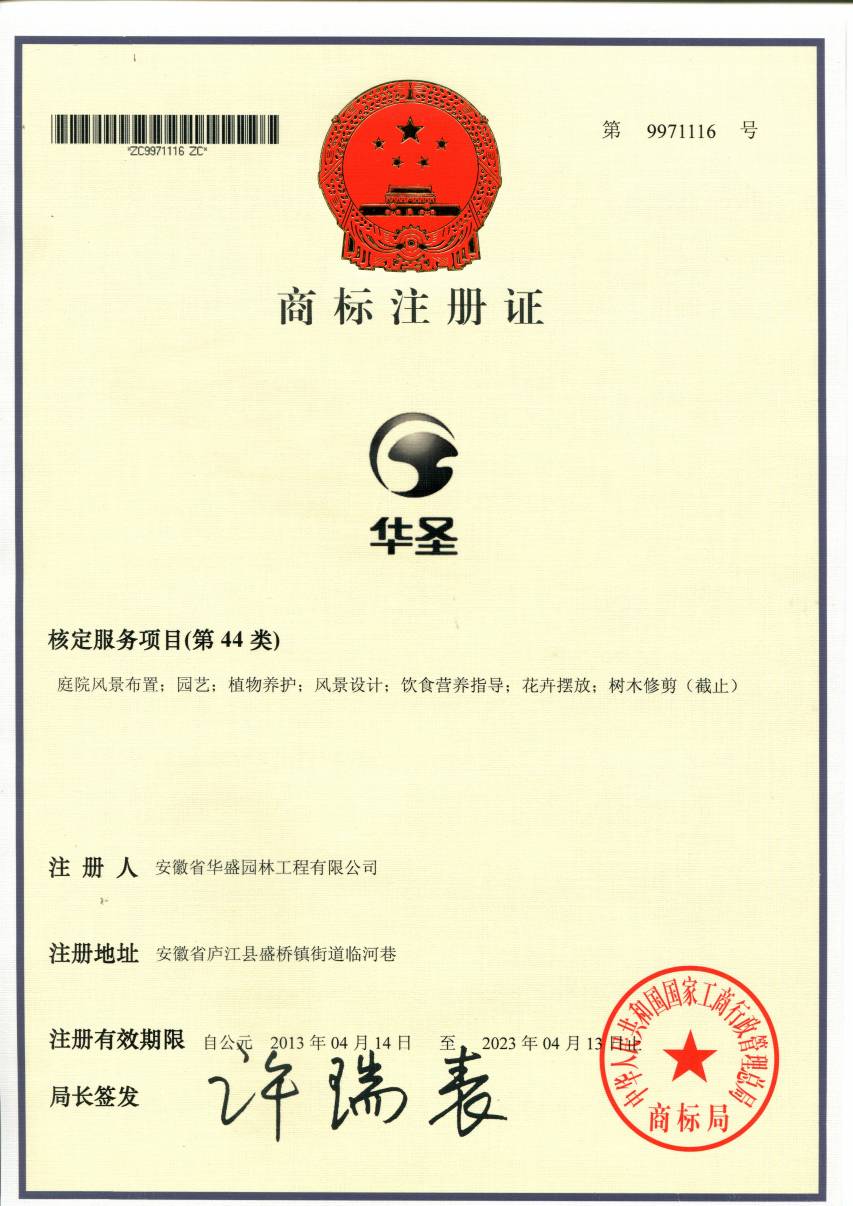 牌商标设计的基本含义是:(1)中徽园林开元网站登录入口的前身为安徽华盛园林工程开元网站登录入口,注册地为庐江县盛桥镇。苗木养护和景观设计均为开元网站登录入口的主导产业。(2)安徽黄山是世界三遗产地(即自然、文化遗产和世界地质公园),迎客松是安徽代表性标识;将华盛园林“盛”字的拼音首字母“S”抽象成迎客松形象,旨在突出企业的名称、地域性和发展使命。(3)圆形象征着地球,加上“华圣”两个汉字构成商标,隐喻开元网站登录入口立足安徽走向世界的美好愿景,象征着企业立足于安徽,面向全国,弘扬爱国、进取、竞争、和谐、勤俭的徽商精神和热情、拼搏、顽强、坚韧、博大的迎客松精神,争创国内一流企业,实现为生态大地扮绿、为美丽中国添彩的执着追求。