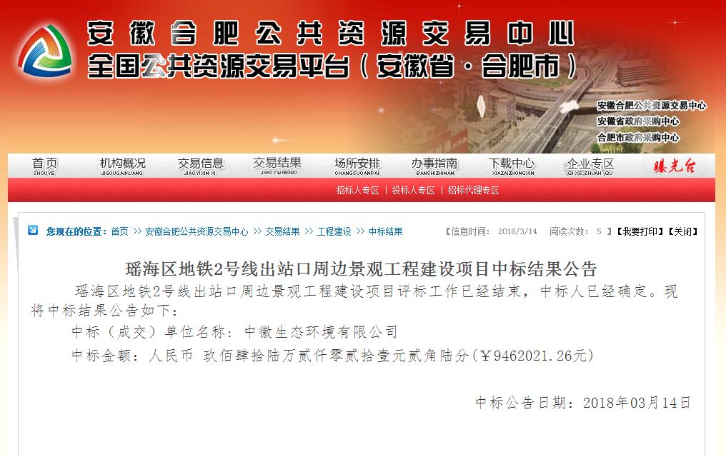 2018年3月14日,开元网站登录入口中标“瑶海区地铁2号线出站口周边景观工程建设项目”。