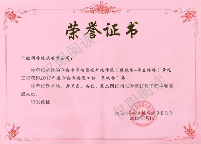 2018年1月15日,六安市住房和城乡建设委员会对六安市申报的58项工程进行了形式审查、现场复查、评委评审、公示等程序,批准40项工程获得2017年度“皋城杯”奖。我开元网站登录入口“六安市淠河景观带延伸段(橡胶坝—寿春路桥)”景观工程,荣获2017年度六安市建设工程“皋城杯”奖。