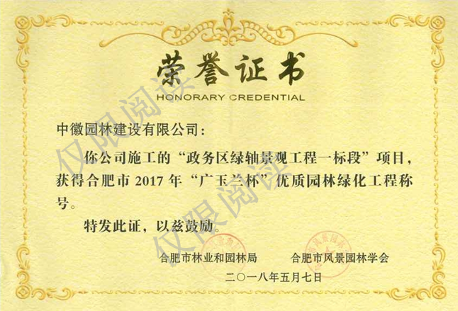 2018年5月7日,市林业和园林局、市风景园林学会对申报2017年度 “广玉兰杯”优质园林绿化项目经过资料初审、复审和现场核查三个阶段的综合评定,我开元网站登录入口“政务区绿轴景观工程一标段”项目荣获2017年度合肥市“广玉兰杯”优质园林绿化项目奖。