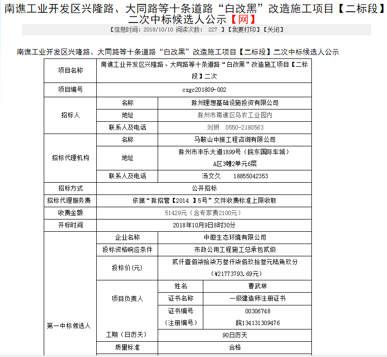 2018年10月10日,开元网站登录入口中标“滁州市南谯工业开发区兴隆路、大同路等十条道路白改黑改造施工项目”。