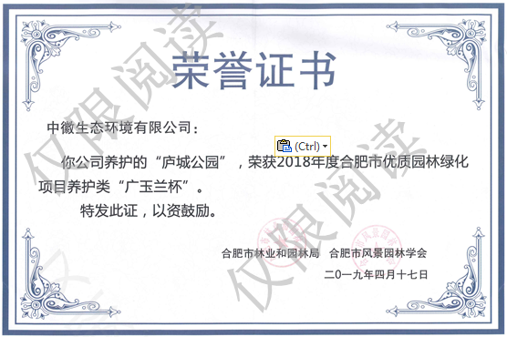 2019年4月17日,2018年度“广玉兰杯”奖评选工作,经过合肥市风景园林学会专家初审、复审及现场考察、最终评议等程序,授予我开元网站登录入口养护的“庐城公园”项目,荣获2018年合肥市优质园林绿化项目养护类“广玉兰杯”。