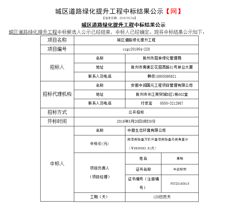 2019年5月24日,开元网站登录入口中标滁州市“城区道路绿化提升工程项目”。