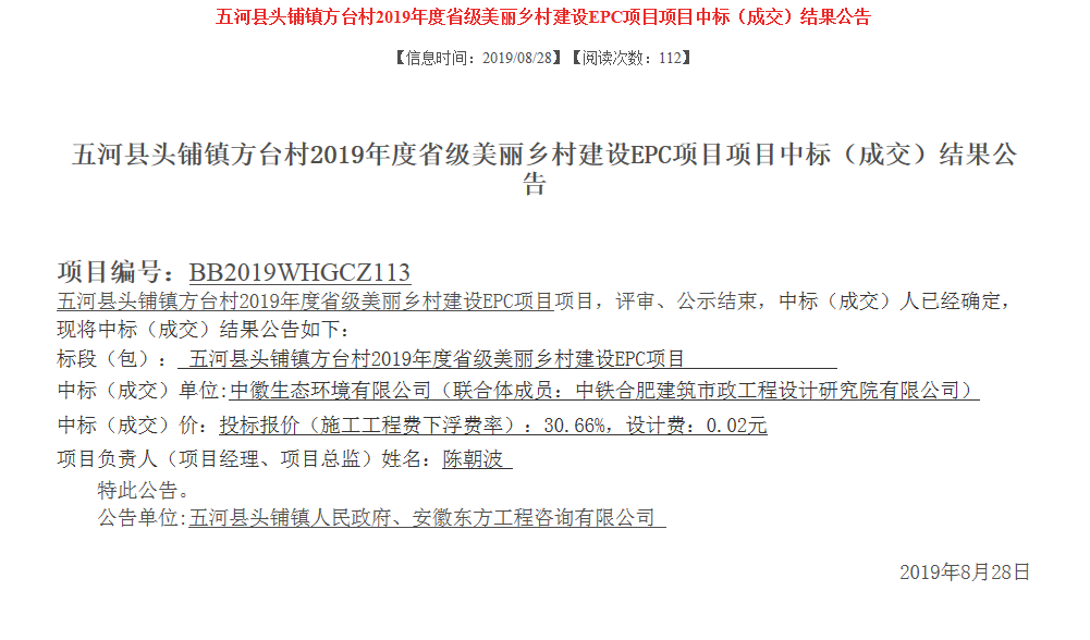 2019年8月28日,开元网站登录入口中标“五河县头铺镇方台村2019年度省级美丽乡村建设EPC项目”。