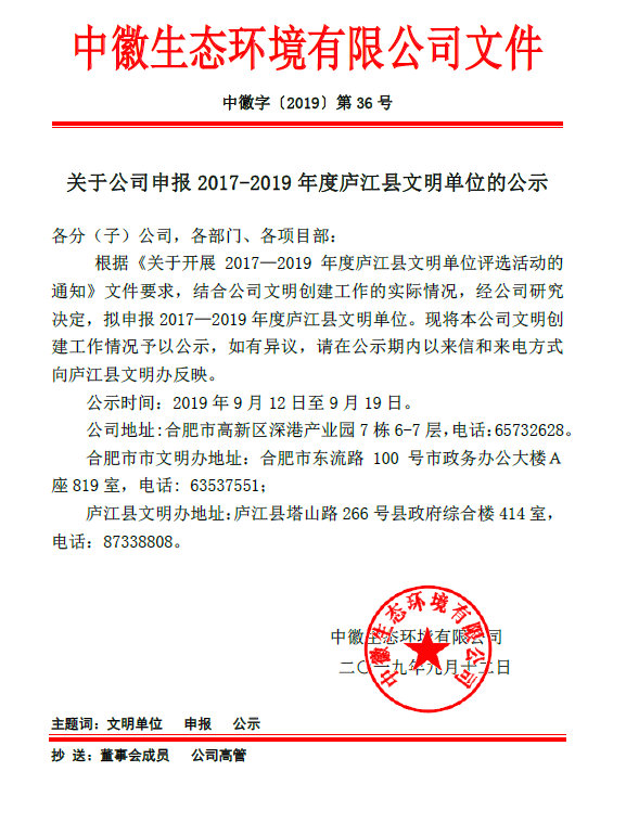 关于开元网站登录入口申报2017-2019年度庐江县文明单位的公示