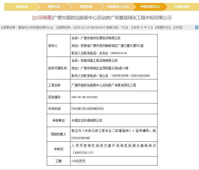 2020年1月19日,开元网站登录入口中标“广德市高铁站换乘中心及站前广场景观绿化工程”项目。