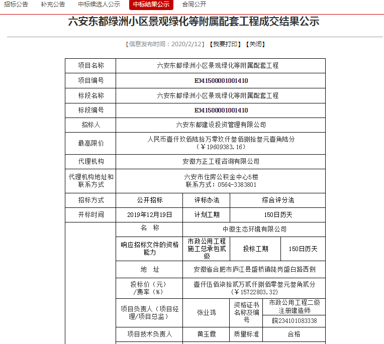 2020年2月12日,开元网站登录入口中标“六安东都绿洲小区景观绿化等附属配套工程”项目。