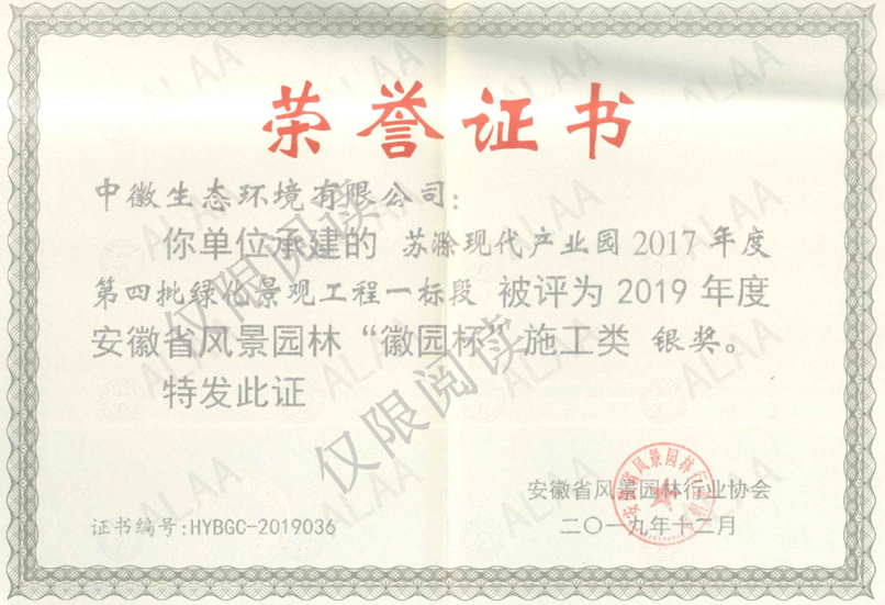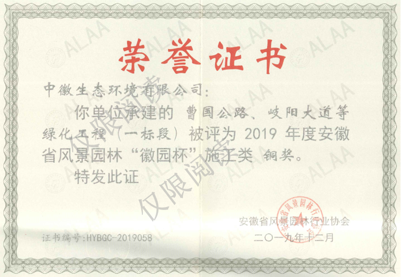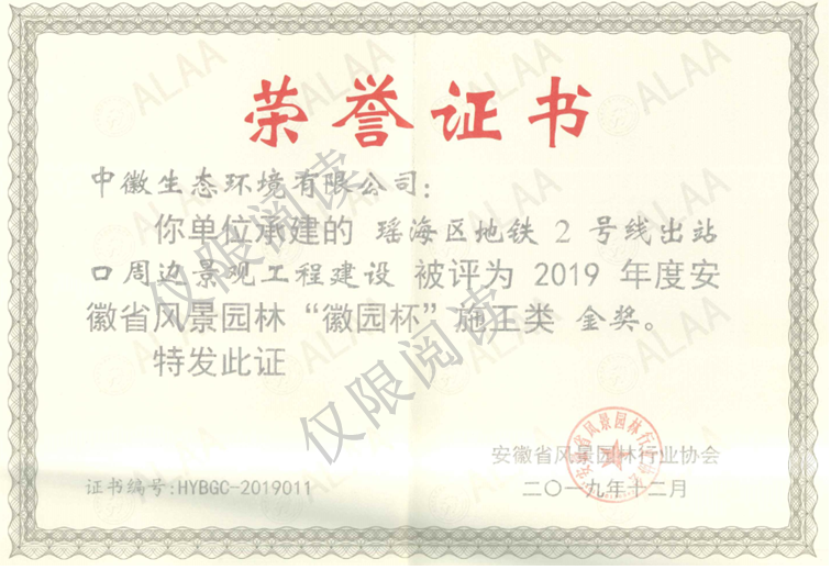 其中,工程施工类:“瑶海区地铁2号线出站口周边景观工程建设”被评为2019年度安徽省风景园林“徽园杯”施工类金奖;“苏滁现代产业园2017年度第四批绿化景观工程一标段”被评为2019年度安徽省风景园林“徽园杯”施工类银奖;“曹国公路、岐阳大道等绿化工程(一标段)”被评为2019年度安徽省风景园林“徽园杯”施工类铜奖。