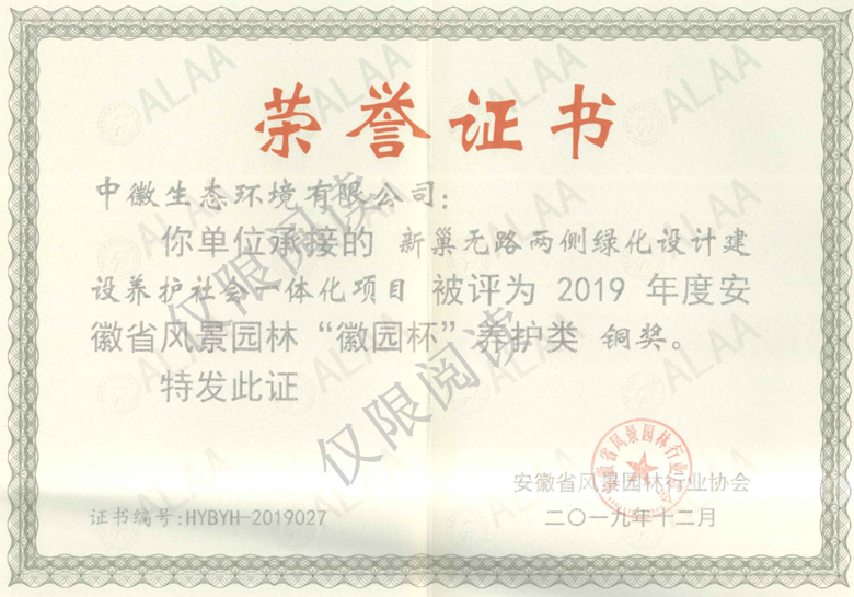 养护类:“新巢无路两侧绿化设计建设养护社会一体化项目”被评为2019年度安徽省风景园林“徽园杯”养护类铜奖。