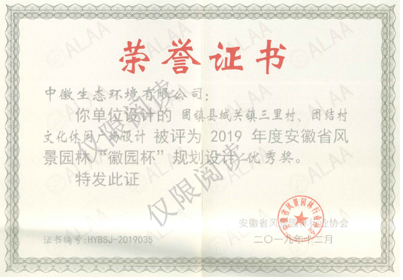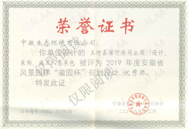 设计类:“固镇县城关镇三里村、团结村文化休闲广场设计”、“五河县淮河休闲公园(设计、采购施工)总承包”被评为2019年度安徽省风景园林“徽园杯”规划设计优秀奖。