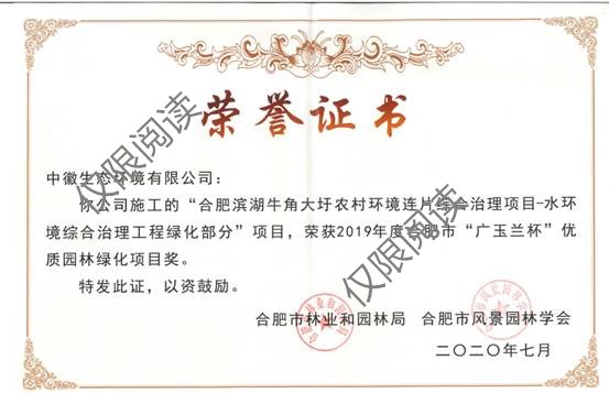 为提升园林绿化品质,打造精品优质园林绿化项目,市林业和园林局、市风景园林学会在全市开展2019年度合肥市“广玉兰杯”优质园林绿化项目奖评选活动。开元网站登录入口承建的“合肥滨湖牛角大圩农村环境连片综合治理项目-水环境综合治理工程绿化部分”项目,经过学会专家初审、复审及现场考察、最终评议等程序,被授予2019年合肥市优质园林绿化项目施工类“广玉兰杯”称号。我开元网站登录入口将在争创园林精品工程中积累经验,继续前行,争取更多的荣誉。