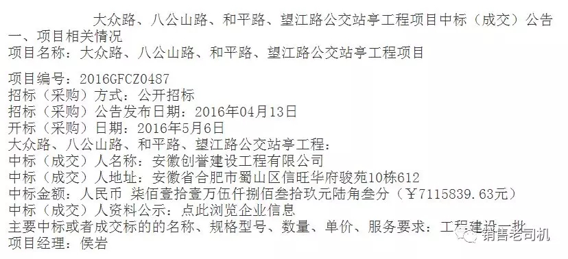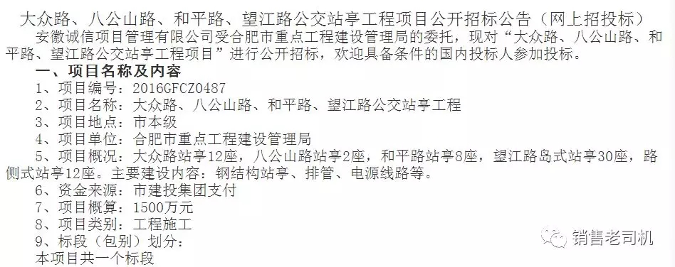 2016年4月13日,望江路公交站亭工程在网上进行了公开招投标,主要建设内容为钢结构站亭、排管、电源线路等,预算价为1500万元。
