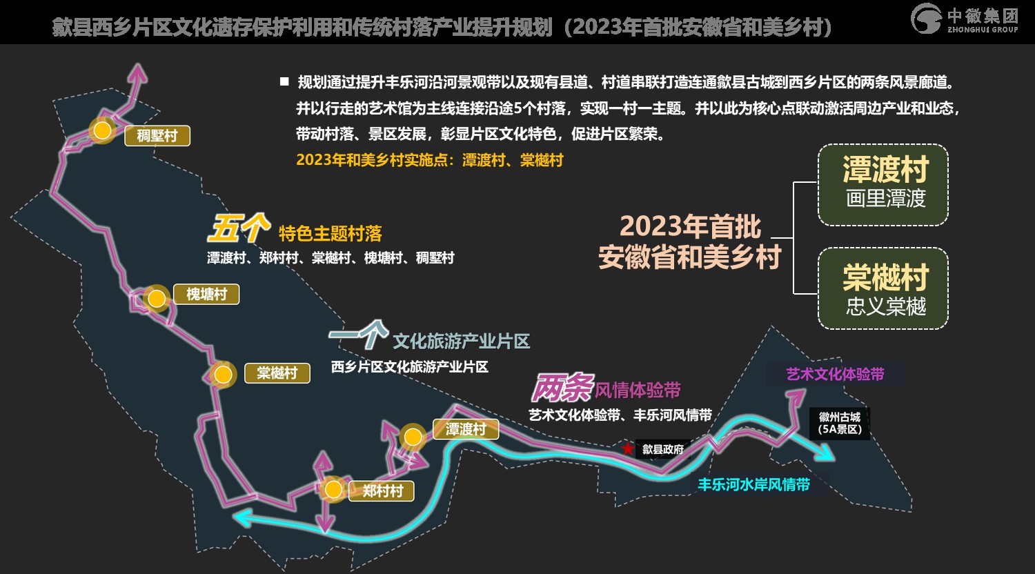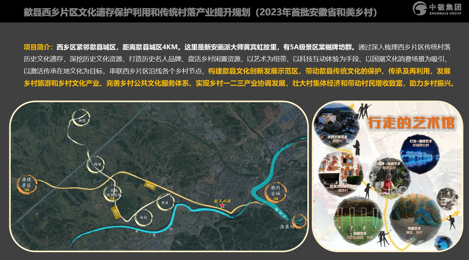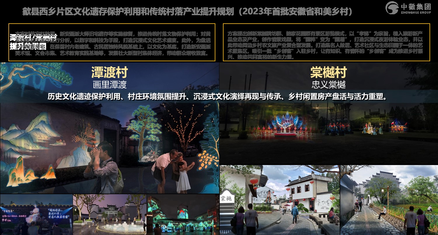 《黄山歙县西乡片区总体策划项目》,对文化遗存保护利用和传统村落产业提升做综合规划,以“行走的艺术馆”为线索,贯穿整个西乡五大片区的文化重塑、文化遗产保护和再利用、生态环境整治、传统村落保护、村庄人居环境提升、乡村运营。其中“潭渡村”和“棠樾村”入选2023年首批安徽省和美乡村精品示范村。