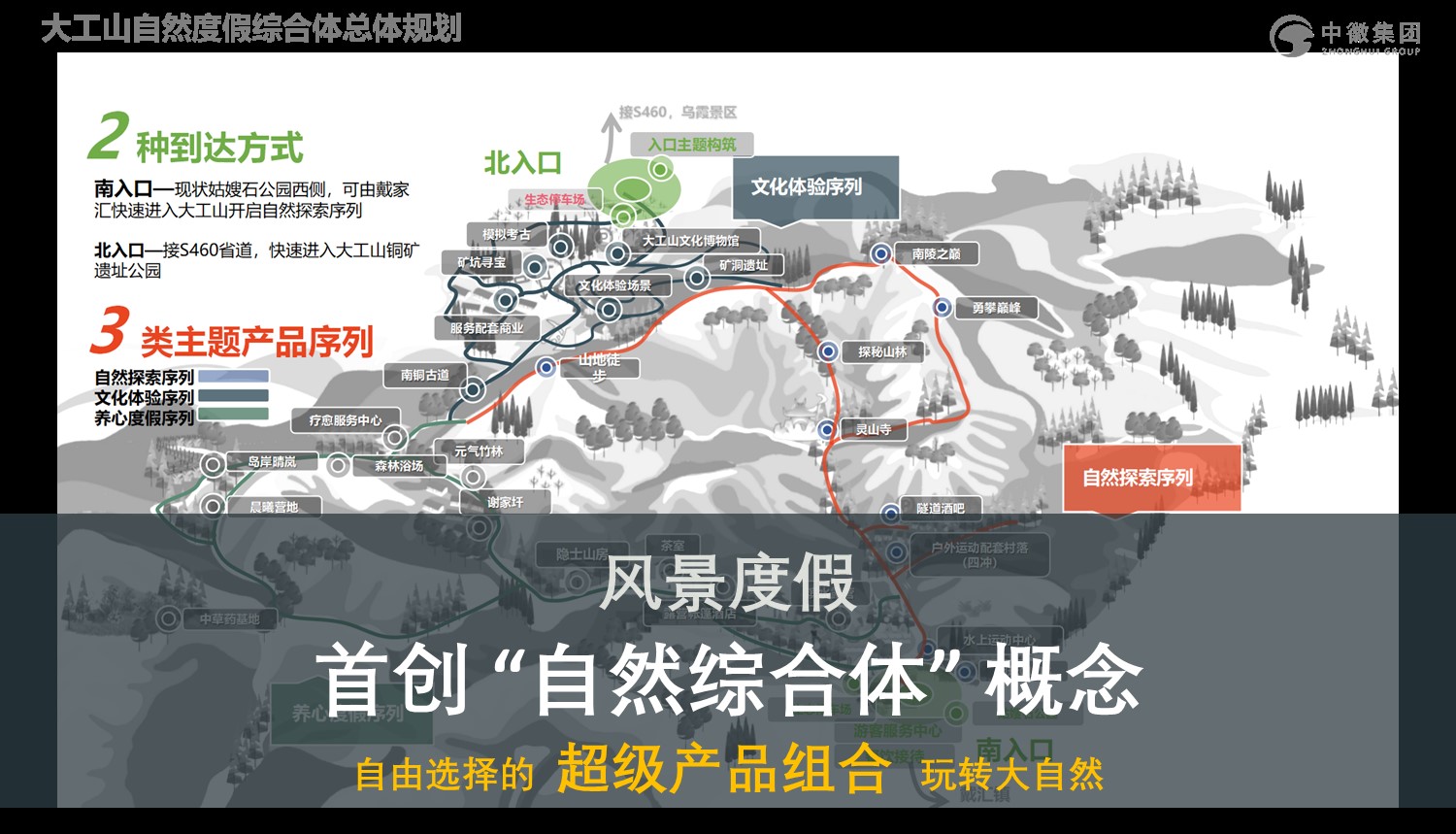 《芜湖南陵大工山自然度假综合体总体规划》整合山水风景为度假产品做依托,首创“自然综合体”概念,结合西周古铜矿遗址和遗存村落的文化体验,以“度假产品超级市场”模式,植入各类户外运动产品组合,自由选择玩转大自然。